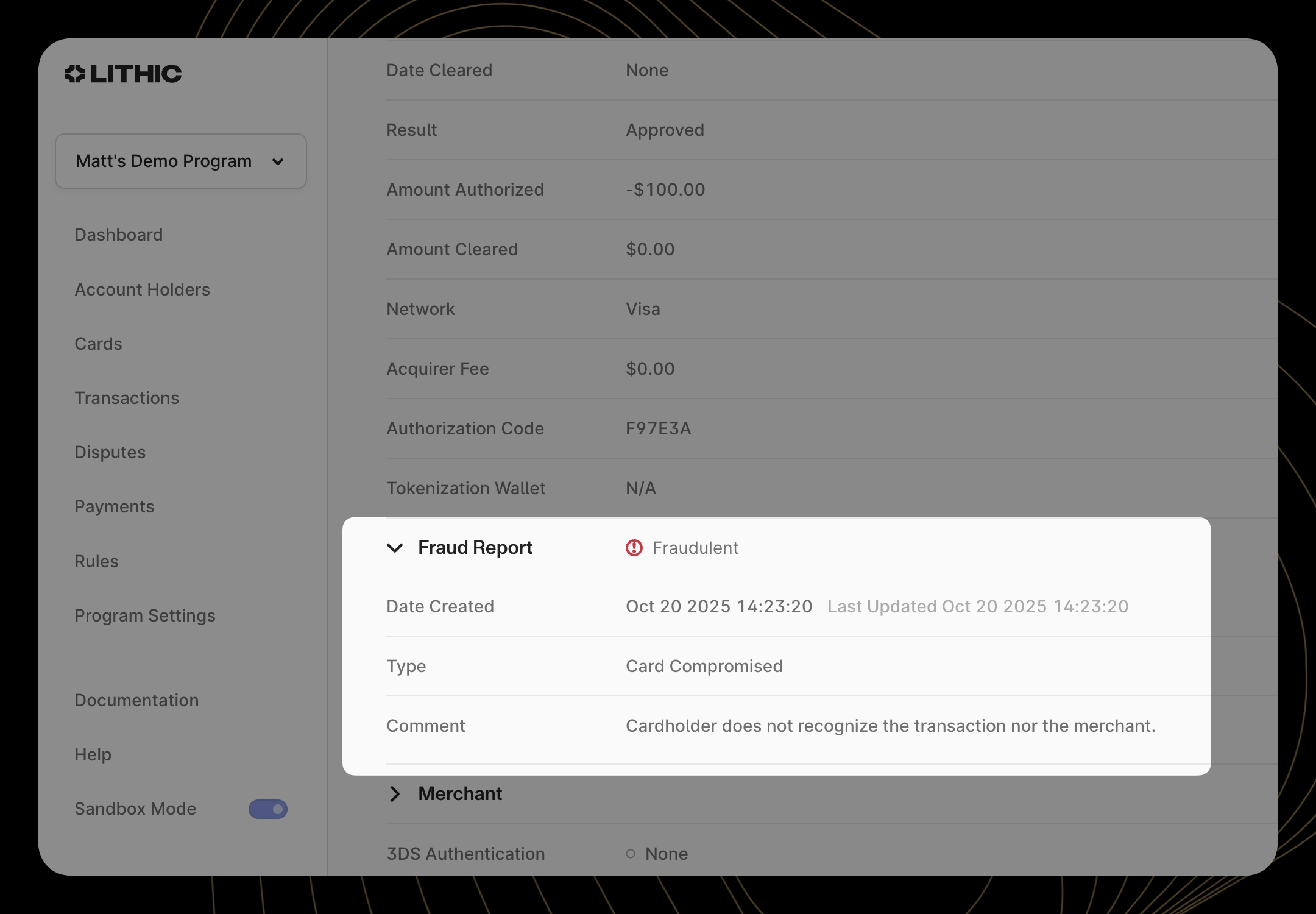 Lithic Dashboard, Fraud Reporting