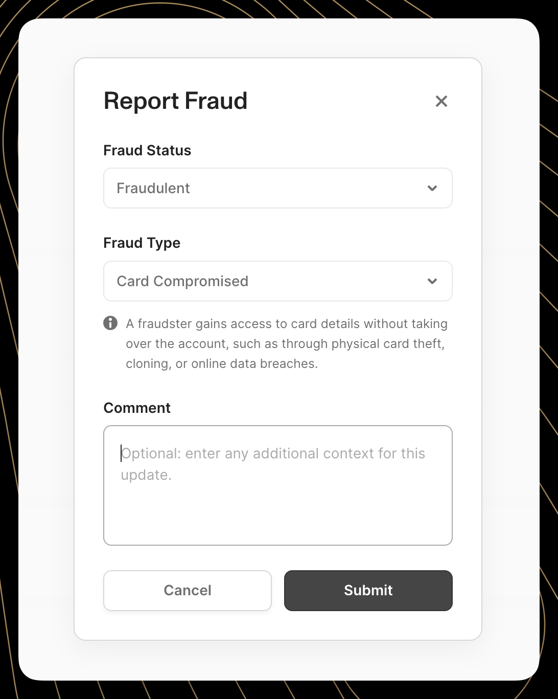 Card programs can now create and update fraud reports directly from the Lithic Dashboard. This new interface provides access to the same fraud reporting capabilities previously available only through the API, enabling users to classify transactions based on their fraud status, specify fraud types, and add contextual comments.
