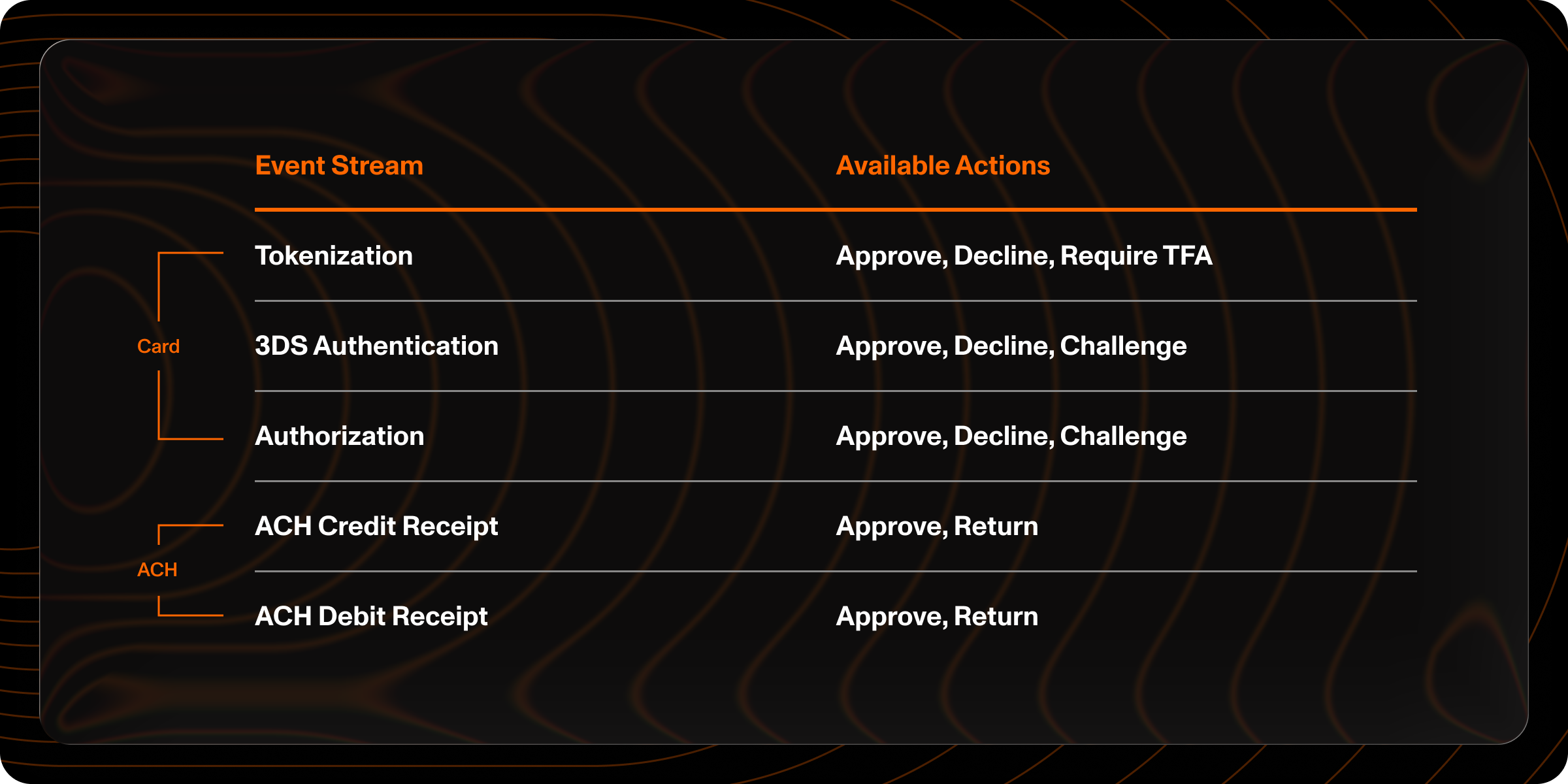 The same decisioning framework extends beyond card rails into ACH. ACH Auth Rules operate on the ACH_CREDIT_RECEIPT and ACH_DEBIT_RECEIPT event streams. These rules control which ACH payments are received by your financial accounts.