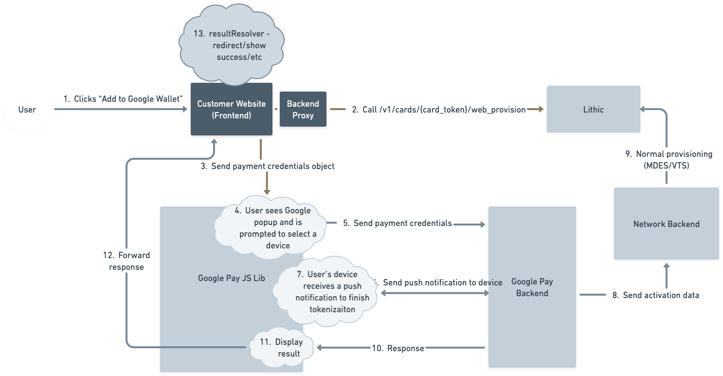 Steps 8-9: The request for tokenization will be completed between Lithic, Apple/Google, and the Network.